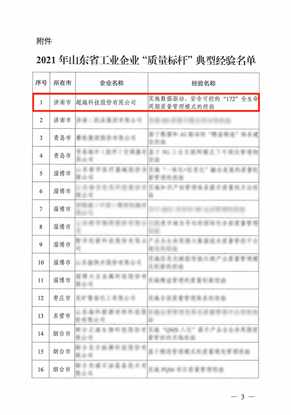 近日,山東省工信廳公布了2021年全省質量標桿名單,超越成功入選并位列榜首!